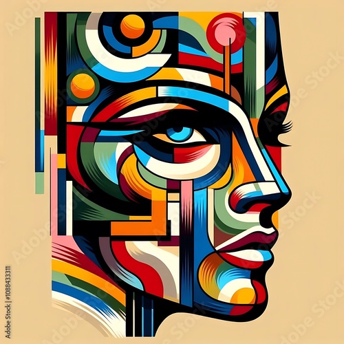 © Indri, Naklejka premium Abstract geometric portrait of a woman's face in profile, vibrant colors and bold lines.