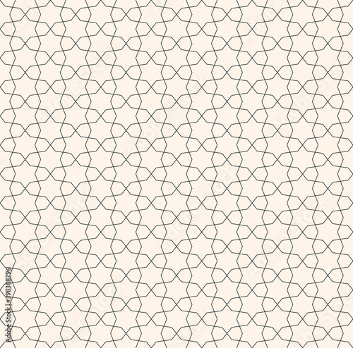 © Olgastocker, Fototapeta premium Abstract geometric seamless pattern in Oriental style. Vector monochrome ornament with thin lines, mosaic, subtle floral grid. Black and white background. Modern minimal design for decor, print, web