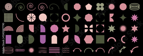 © Кирилл Макаров, Fototapeta premium Abstract geometric set icon. Collection of various shapes, spirals, lines, arrows, and decorative patterns in pink, purple, and green on a black background. Minimalist, modern, and artistic elements