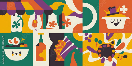 Fototapeta premium Abstract geometric shapes and patterns in green orange and purple create a playful and modern design