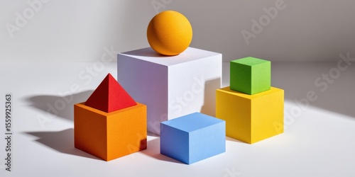 Obraz premium Abstract geometric shapes, colored blocks, balance, cube, sphere, pyramid, structure, solid, modern, form