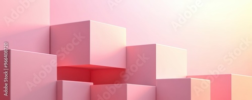 © Rattanathip, Obraz premium Abstract geometric shapes in pink tones forming a stair-like pattern. Modern minimalist design with a soft gradient background.