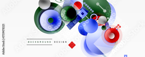 Obraz premium Abstract geometric shapes overlap. Circles, squares, lines create modern design. Colors include blue, red, green, gray. Minimalist composition.