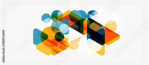 Naklejka premium Abstract geometric shapes overlap, creating vibrant color blends. Composition features circles, triangles, squares, soft gradients.