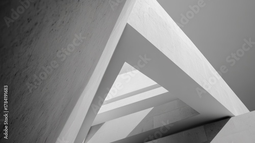 © Soklin, Fototapeta premium Abstract geometric shapes, white and black, forming a triangular pattern in a modern architectural setting.