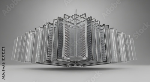 © Hermanto653, Obraz premium Abstract Geometric Structure with Metal Mesh and Glass Panels in Gray Tones.
