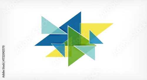 © Anak, Fototapeta premium Abstract Geometric Triangles Composition with Overlapping Blue, Green, and Yellow Shapes on a White Background