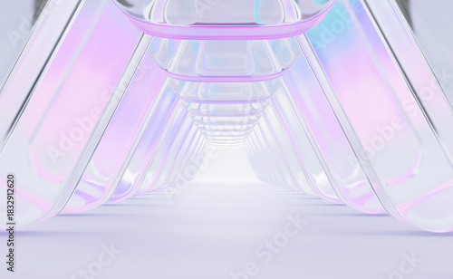 © marozhkastudio, Fototapeta premium Abstract glass architecture 3d background. Pastel light corridor with transparent columns, pink blue purple holographic gradient. Hallway room interior, futuristic tunnel perspective. 3D illustration