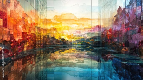 © adiba sakila atmari, Naklejka premium Abstract glass landscape reflecting light with mountain and vibrant color design