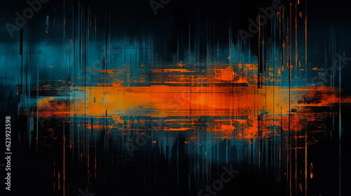 © Tepsarit, Obraz premium Abstract glitch overlay distressed background. Digital noise with orange and blue color artifacts dust scratches dirt stains texture on dark background. Digital illustration generative AI.