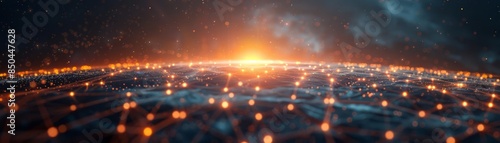Obraz premium Abstract global network with illuminated nodes and connecting lines, sunrise...