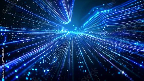 Naklejka premium Abstract glow neon data technology lines and particles in blue. A space of lines go forward, cyberspace in depth of field.