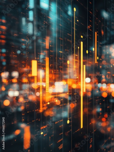 © Johannes, Fototapeta premium Abstract glowing big data forex candlestick chart on blurry city backdrop. Trade, technology, investment and analysis concept. Double exposure