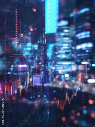 © Johannes, Fototapeta premium Abstract glowing big data forex candlestick chart on blurry city backdrop. Trade, technology, investment and analysis concept. Double exposure