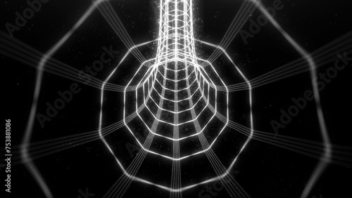 Naklejka premium Abstract glowing black and white digital VJ tunnel made by lines and bokeh particles moving on the dark background. Futuristic, Sci Fi, Cyberspace, Technology, Neon Tube, Empty Space.