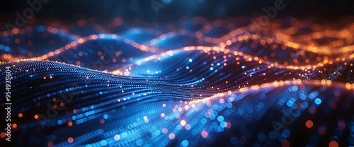 © Helois, Obraz premium Abstract glowing blue and orange particles in a wavy pattern.