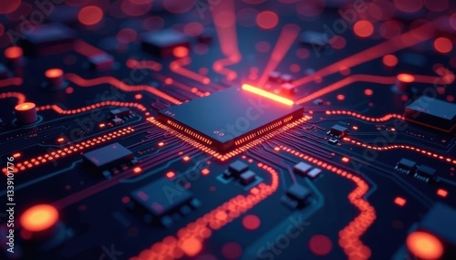 Fototapeta premium Abstract glowing circuit board, futuristic tech texture, red, artificial...