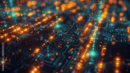 Fototapeta premium Abstract glowing circuit board with blue and orange lights, representing...