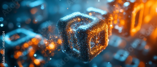 Fototapeta premium Abstract glowing cubes shimmer with particles, creating interconnected network, suggesting digital art futuristic design.