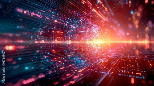 Fototapeta premium Abstract glowing digital tunnel with a glowing sphere in the middle.