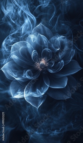 Fototapeta premium Abstract glowing flower with ethereal blue petals on a dark background, creating a mystical and serene atmosphere