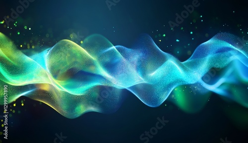 © Bargais, Obraz premium Abstract glowing green and blue wavy lines on a dark background with a bokeh effect.