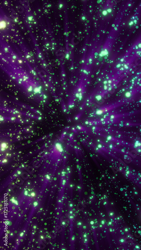 Fototapeta premium Abstract glowing green particles on a purple background, futuristic energy and cosmic digital atmosphere