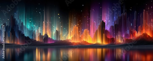 © Georgii, Obraz premium Abstract glowing light towers with vibrant reflections on a calm surface