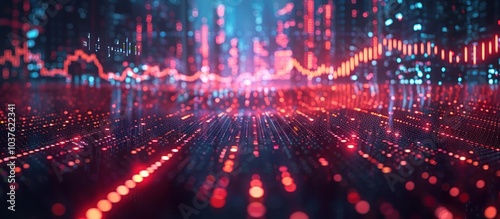 Obraz premium Abstract glowing lines and dots in a dark background with red and blue light.