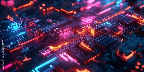 © Wish Craft Arts, Obraz premium Abstract glowing neon lines and shapes in a futuristic tech setting.