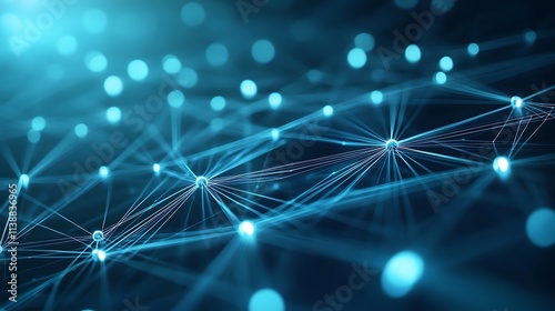 Obraz premium Abstract glowing network of connected points and lines on a dark blue background with bokeh lights
