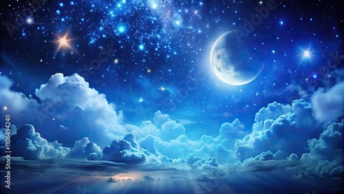 Fototapeta premium Abstract glowing peaceful background with blue night sky, moon, stars, and beautiful clouds, Peaceful, Abstract, Glowing, Background