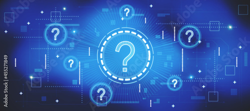 Fototapeta premium Abstract glowing question marks interface on blurry blue background....