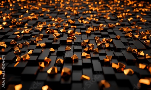 © Rini, Obraz premium Abstract gold pyramids on black cubes background.