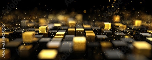Obraz premium Abstract golden and black cubes with glittering particles on a dark background