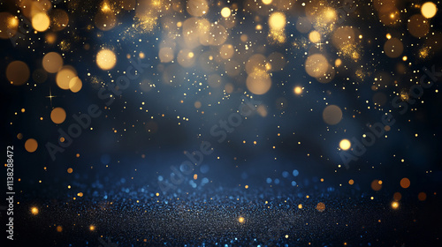 Fototapeta premium Abstract golden bokeh lights on a dark blue background with glitter and stars