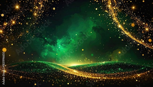 © Andi, Naklejka premium Abstract Golden Sparkles and Green Nebula Cosmic Background Display.