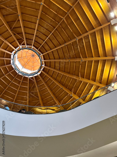 © GloWinChoice, Obraz premium Abstract golden wooden ceiling in circular pattern. Minimal architectural texture with copy space. Editable background for branding, presentation, or text overlay