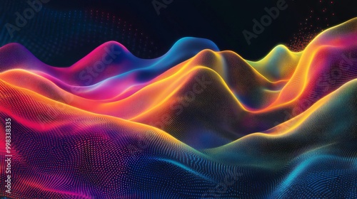 © Elshad Karimov, Obraz premium Abstract gradient hologram dynamic wave of particles. Digital technology background with smooth flow of colored abstract lines. Vector illustration.