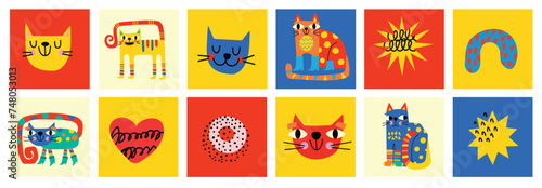 Fototapeta premium Abstract Graphic Elements set in Minimal Trendy Style. Hand drawn doodle cats, spots, drops, curves, lines for creating patterns, Invitations, posters, cards, social media posts