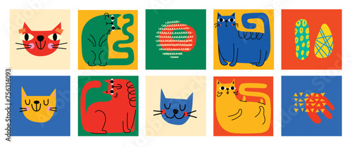 © virinaflora, Fototapeta premium Abstract Graphic Elements set in Minimal Trendy Style. Hand drawn doodle cats, spots, drops, curves, lines for creating patterns, Invitations, posters, cards, social media posts