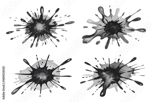 © Emongrapic, Obraz premium Abstract grayscale ink splatters: four high-resolution watercolor designs, perfect for artistic backgrounds or design elements.