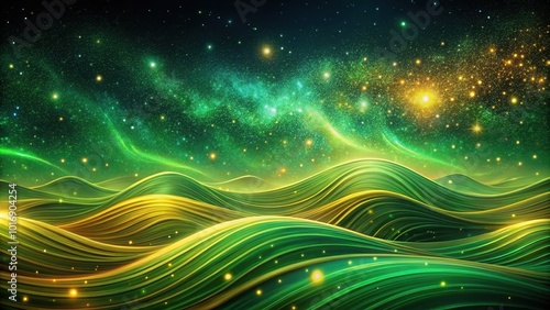 Obraz premium Abstract green and gold waves in a starry night sky long shot
