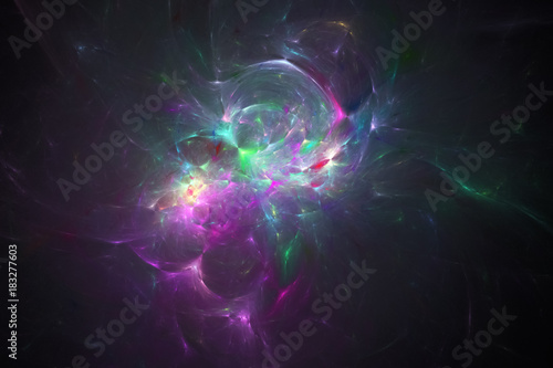 Fototapeta premium Abstract green and violet swirly shapes on black background. Fantasy fractal...