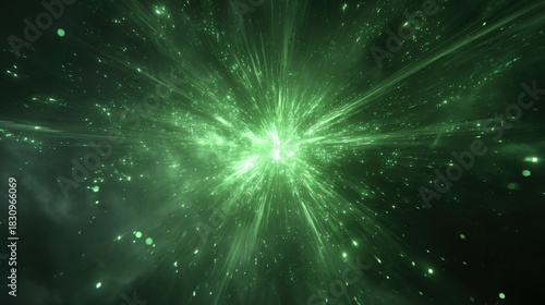 © The Little Hut, Fototapeta premium Abstract Green Explosion of Light and Energy Background, Particle Burst, Cosmic Ray Illustration