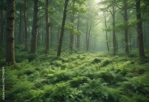© OneWayPhoto, Obraz premium Abstract green forest, unfocused, soft, fuzzy texture, dreamy atmosphere , nature, background