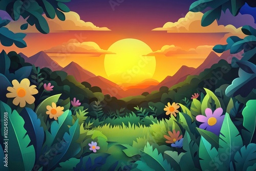 Fototapeta premium Abstract green meadow with vibrant flowers and a warm sunset, ideal for...