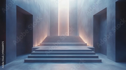 Fototapeta premium Abstract Grey Stone Hallway with Glowing Blue Light and Stairs