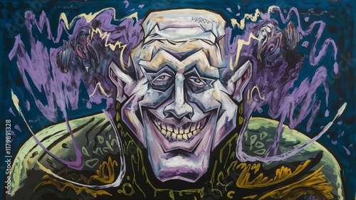 © Marina, Obraz premium Abstract grotesque face, twisted smile, chaotic brush strokes creating unsettling atmosphere