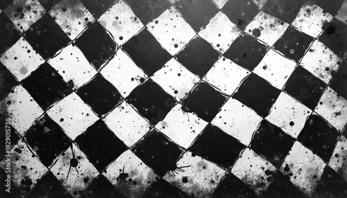 Obraz premium Abstract grunge chequered flag pattern with black and white squares. Ink splatters and brush strokes add distressed texture. Modern graphic design for auto sport or victory themes.
